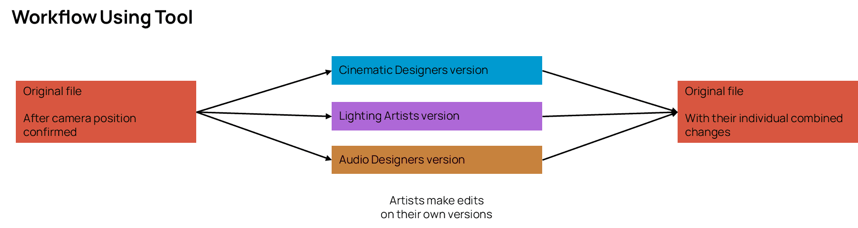 Previously, the cinematic team would work on their local versions and copy their changes manually into the latest file version. They would also wait on each other and coordinate who would checkout the file. This easily caused conflicts and introduced human error. It would also cause variations between the artist's original vision and the final submitted version.