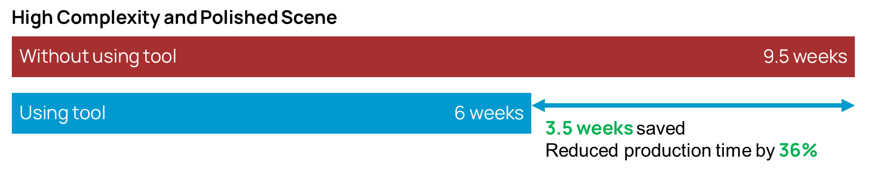 Complex scenes production time was reduced by 9.5 weeks to 6 weeks.
