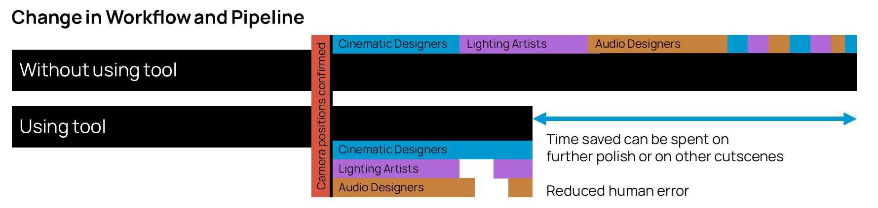 The cinematic team often faced the challenge of completing multiple lower-complexity cutscenes, where the camera angles and lighting setups remained consistent. However, they still had to manually replicate and adjust the timings for lighting and other elements from previously completed scenes. This process was time-consuming and prone to human error, which led to inefficiencies. The tool aims to address these issues by streamlining the workflow, reducing the potential for mistakes, and saving the cinematic team's valuable time.